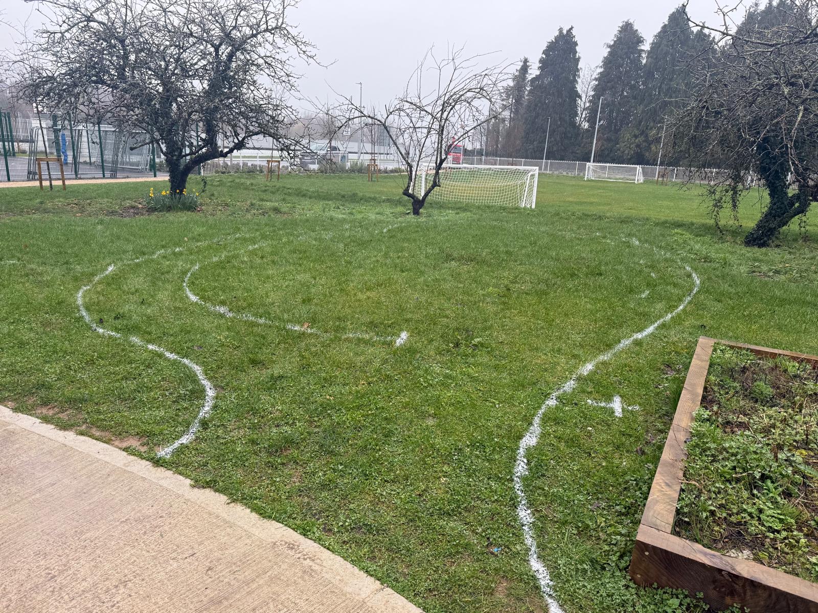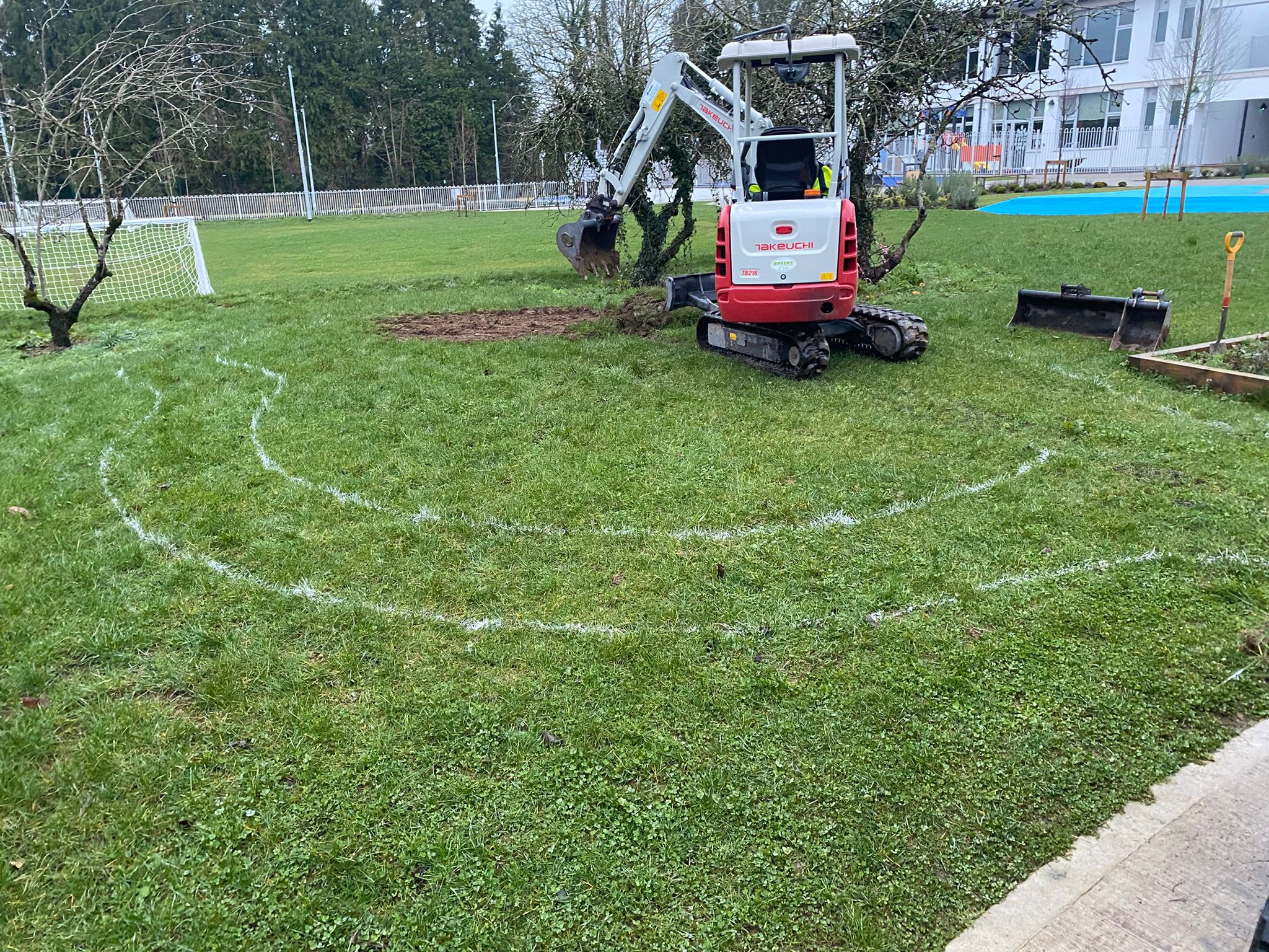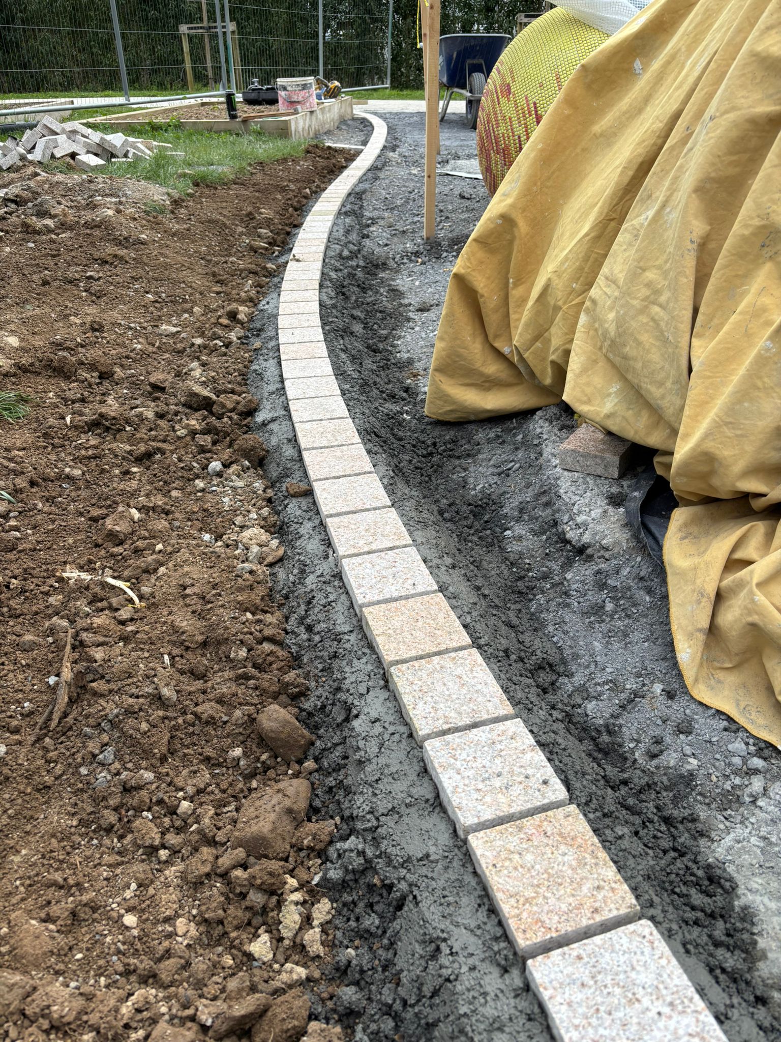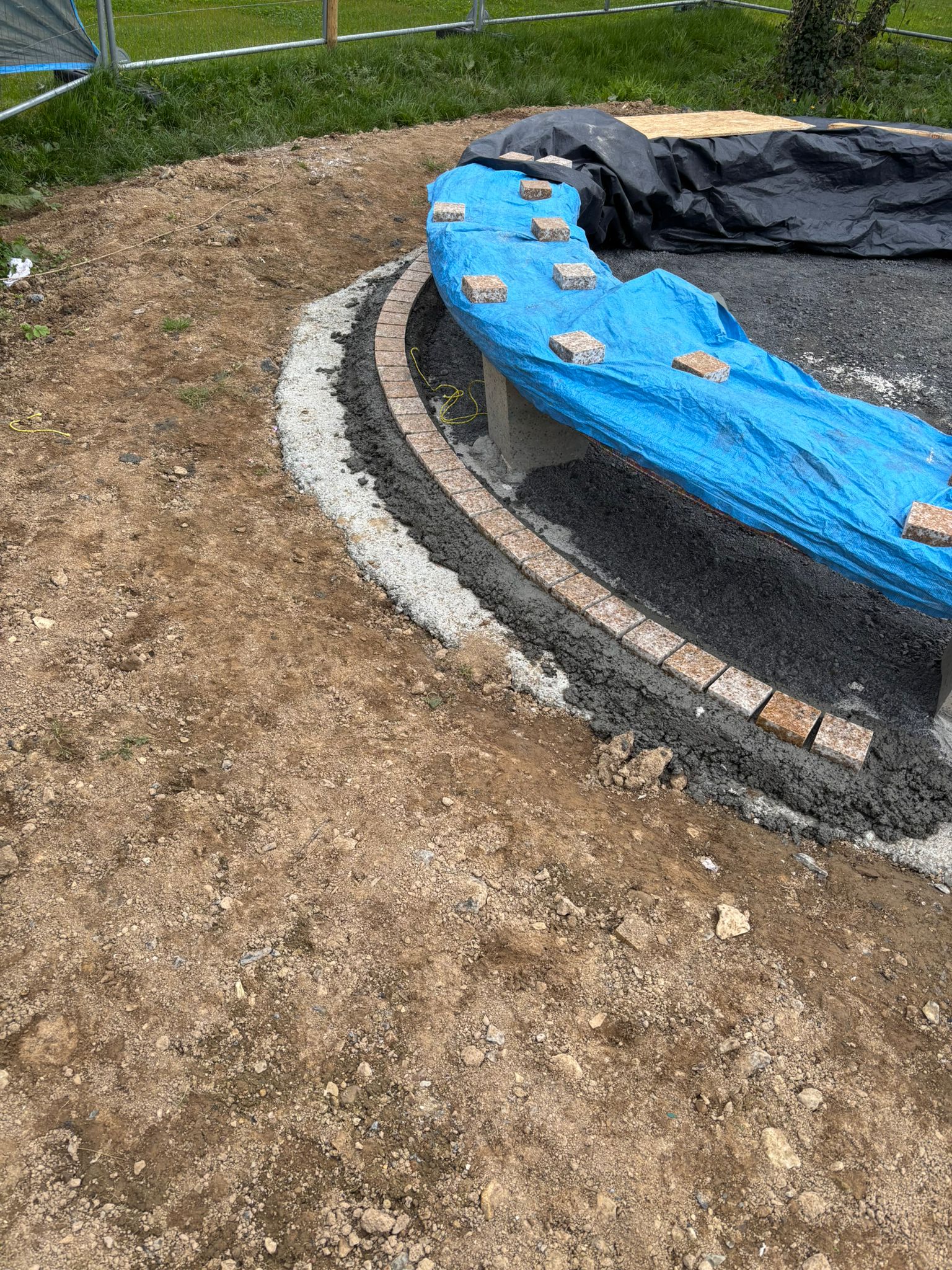 The perimeter of the area is defined using granite set edging, installed to create a strong, high-quality boundary between the resin surface and adjoining grassed areas. The granite sets are laid to follow the curved geometry of the design, bedded and haunched in concrete to ensure durability, edge restraint, and long-term stability.