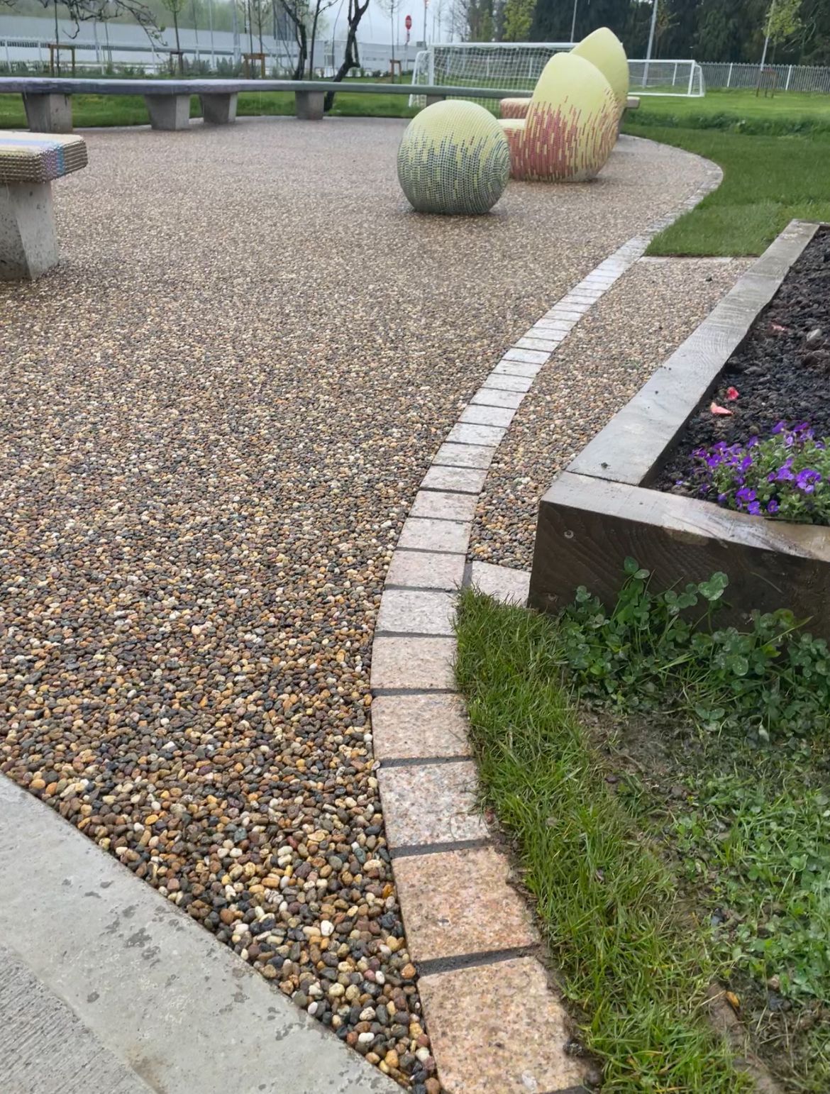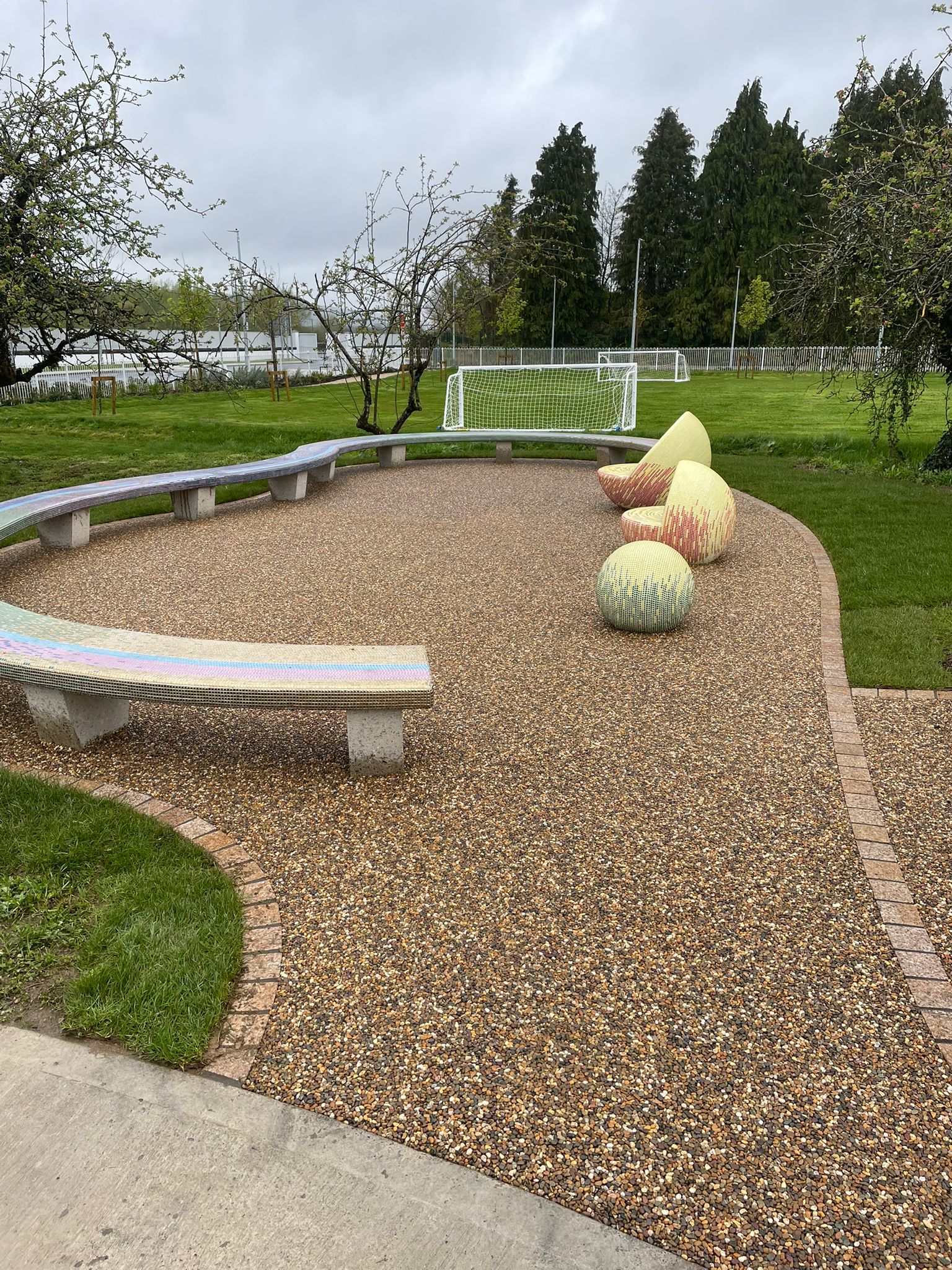 The layout follows a flowing, curved design incorporating fixed seating with an open central area. The construction comprises a well-prepared and compacted sub-base, finished with a permeable resin aggregate surface. This provides a smooth, seamless, and non-slip finish, suitable for all-weather use while allowing for effective drainage and low maintenance.