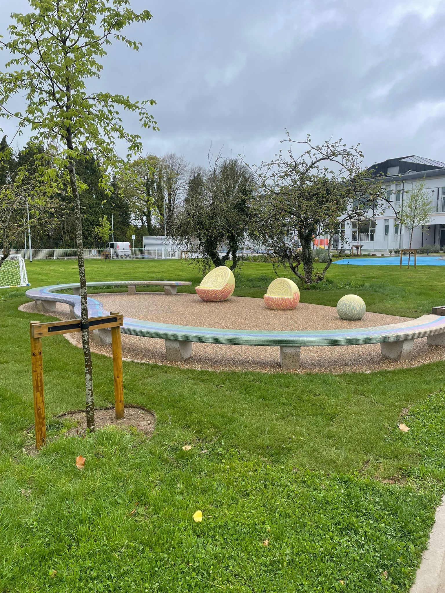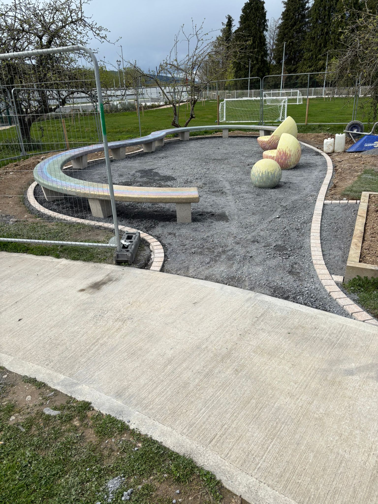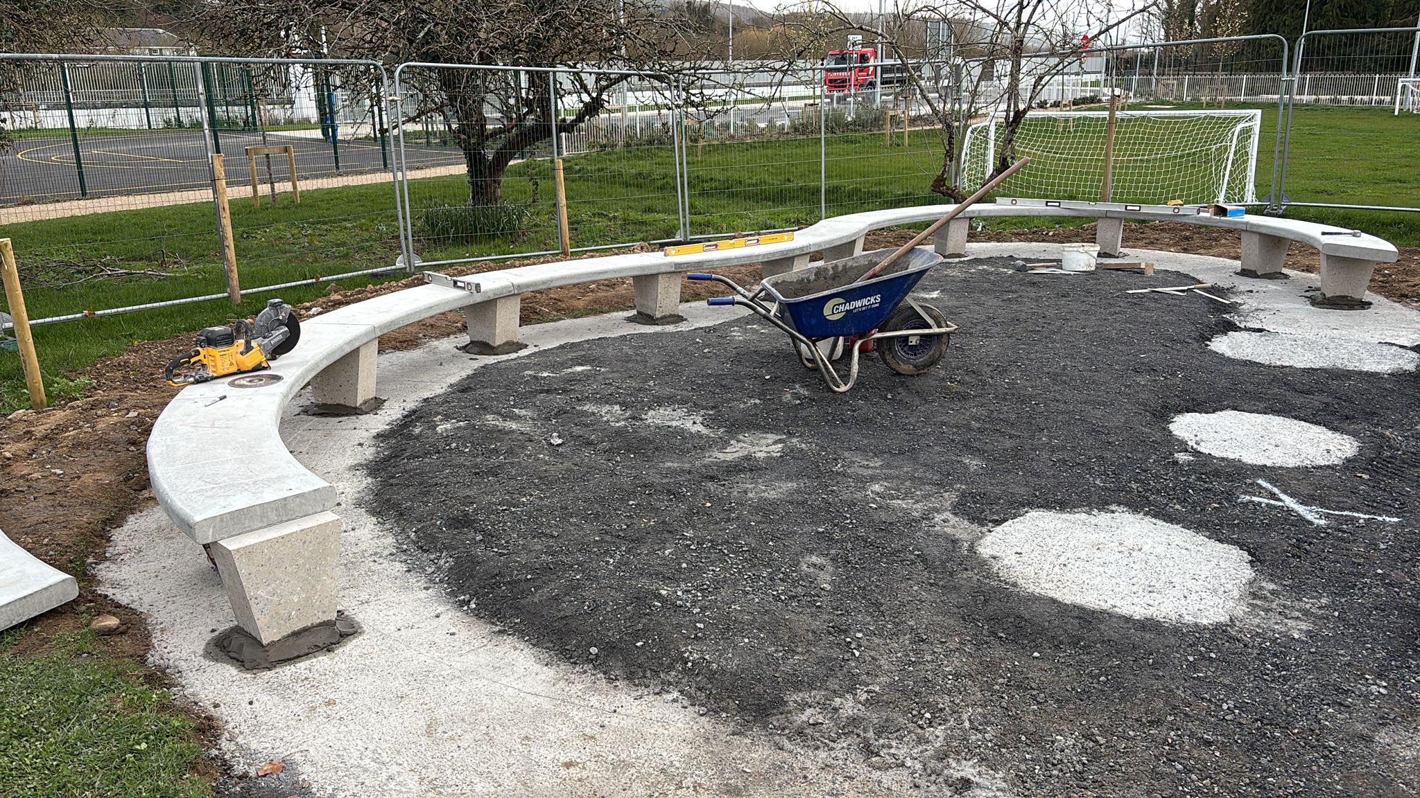 A curved precast concrete seating arrangement has been installed on concrete foundations, providing structured seating for group use. The central area includes decorative sculptural elements to enhance the space visually and encourage engagement.