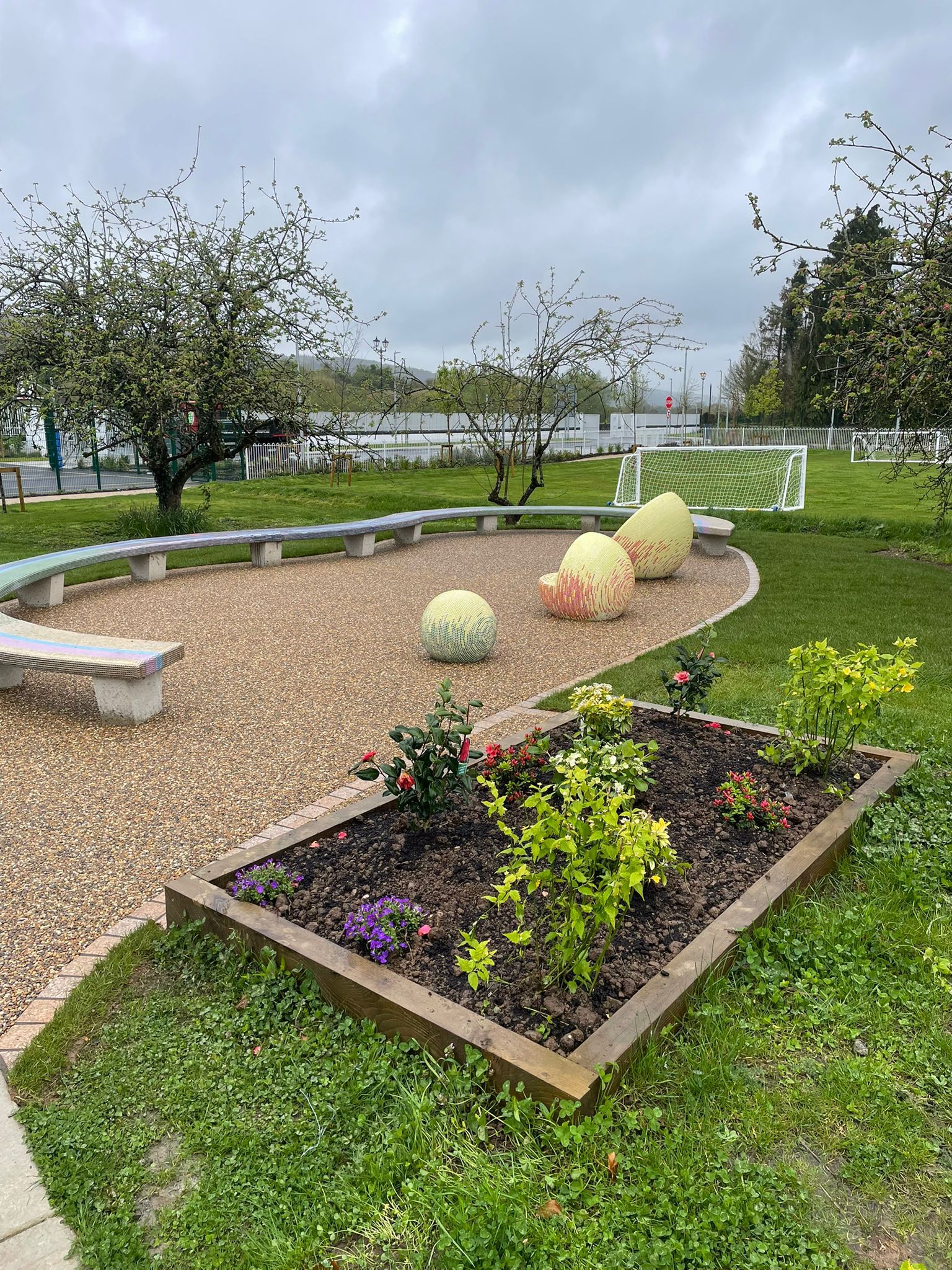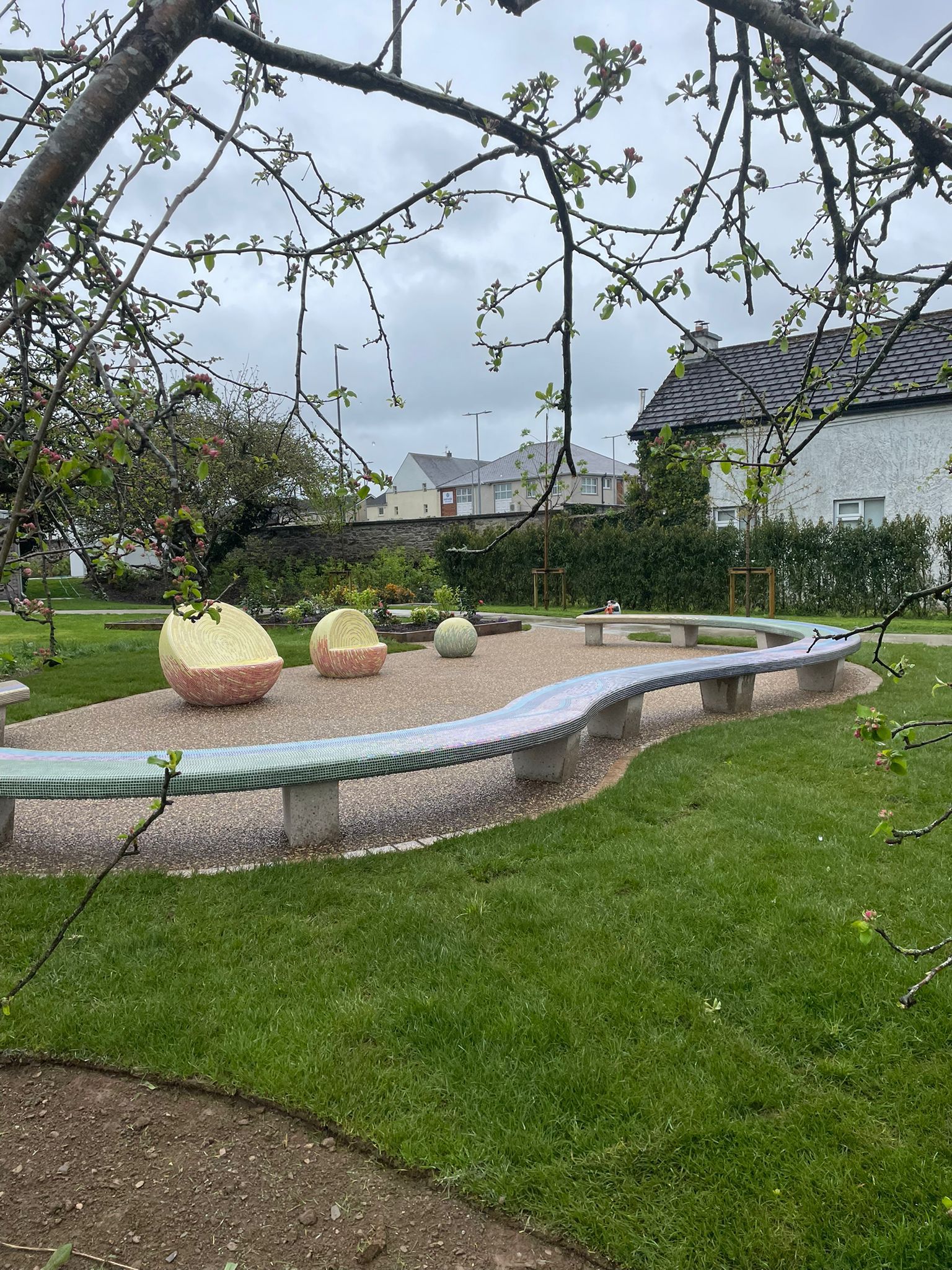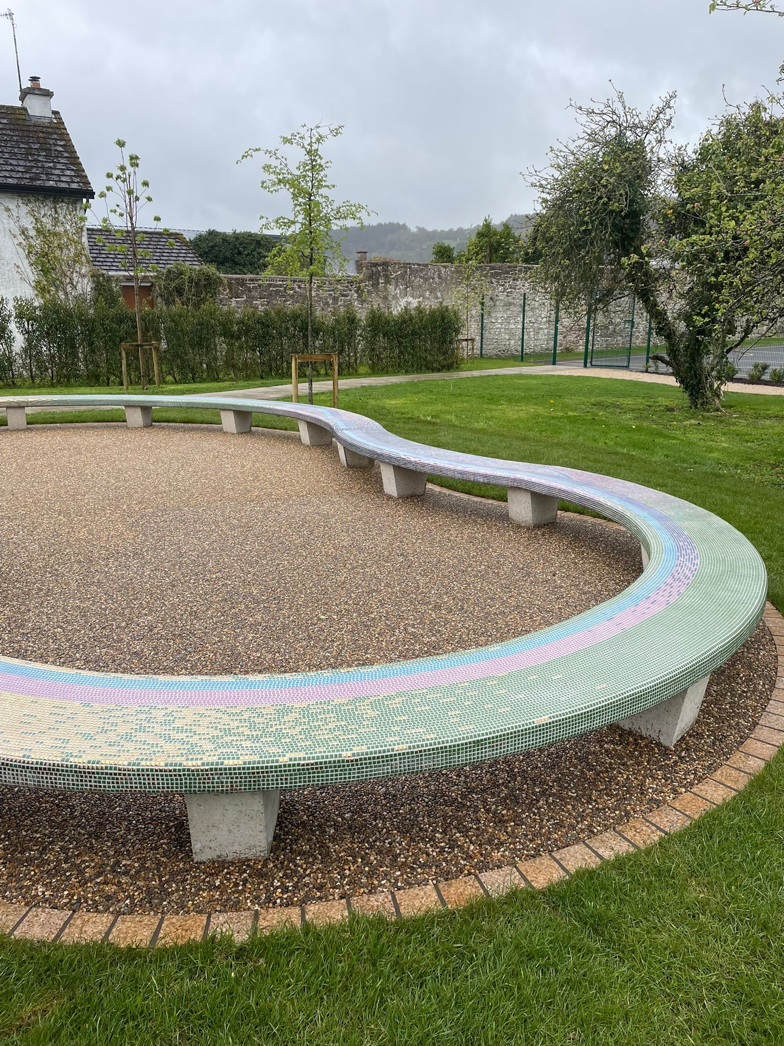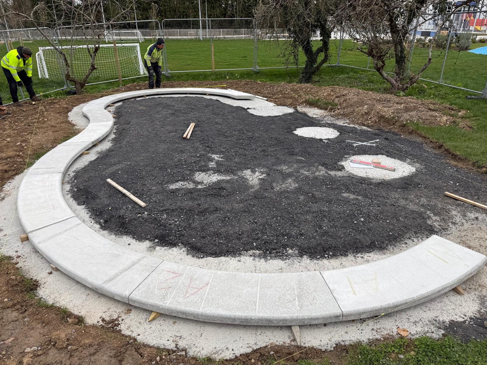 A curved precast concrete seating arrangement has been installed on concrete foundations, providing structured seating for group use. The central area includes decorative sculptural elements to enhance the space visually and encourage engagement.